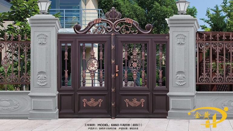 本款铝艺庭院门,型号是9010,任何尺寸均可定做,镂空门扇采用各种尺寸铝型材及铝花拼接而成,实心门扇采用整体铸铝板而成。注意:整体纯铝门柱款式及尺寸可根据客户实际要求量身定制。